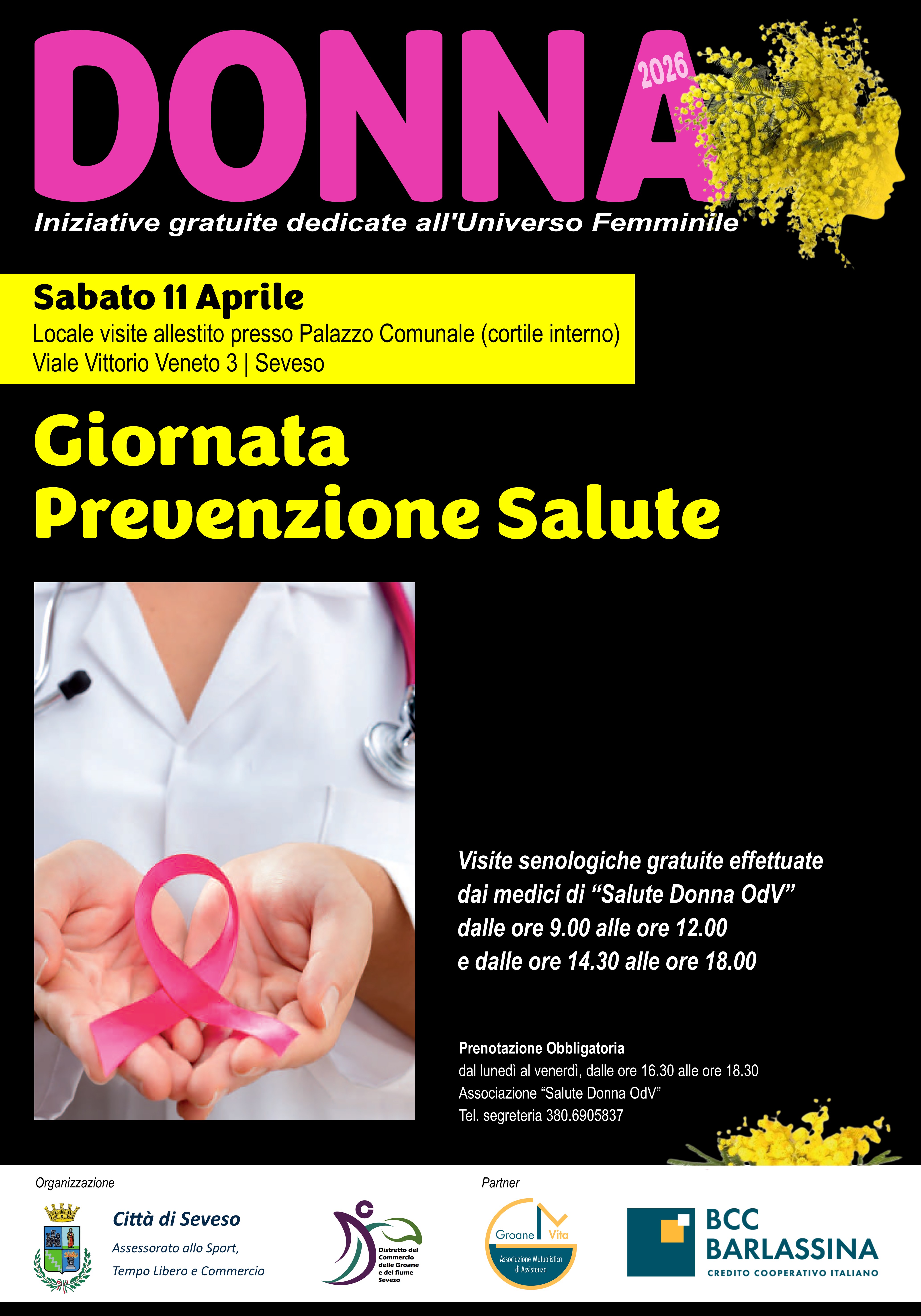 Sono aperte le prenotazioni per la doppia giornata dedicata alla prevenzione. Anche quest'anno i medici di Salute Donna ODV si metteranno a disposizione per le visite senologiche gratuite nelle giornate di sabato 14 Marzo e sabato 11 Aprile (mattina e pomeriggio). Sarà allestito uno spazio nel cortile interno del palazzo municipale.